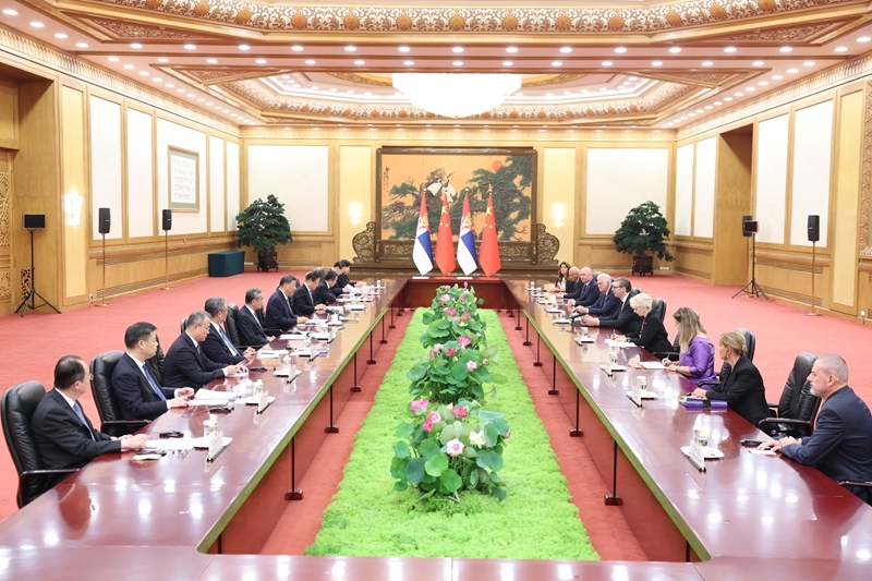9月4日下午,国家主席习近平在北京人民大会堂会见来华出席纪念中国人民抗日战争暨世界反法西斯战争胜利80周年活动的塞尔维亚总统武契奇。新华社记者 黄敬文 摄