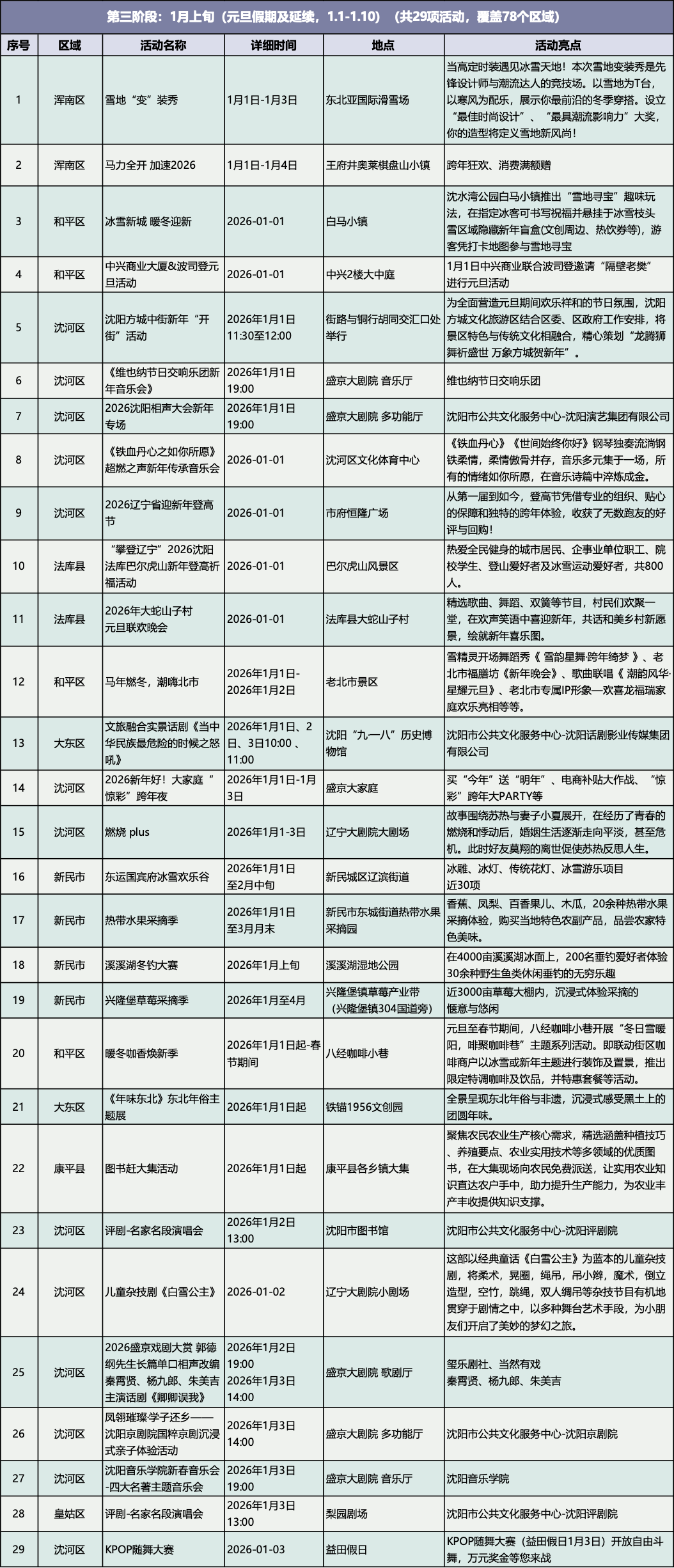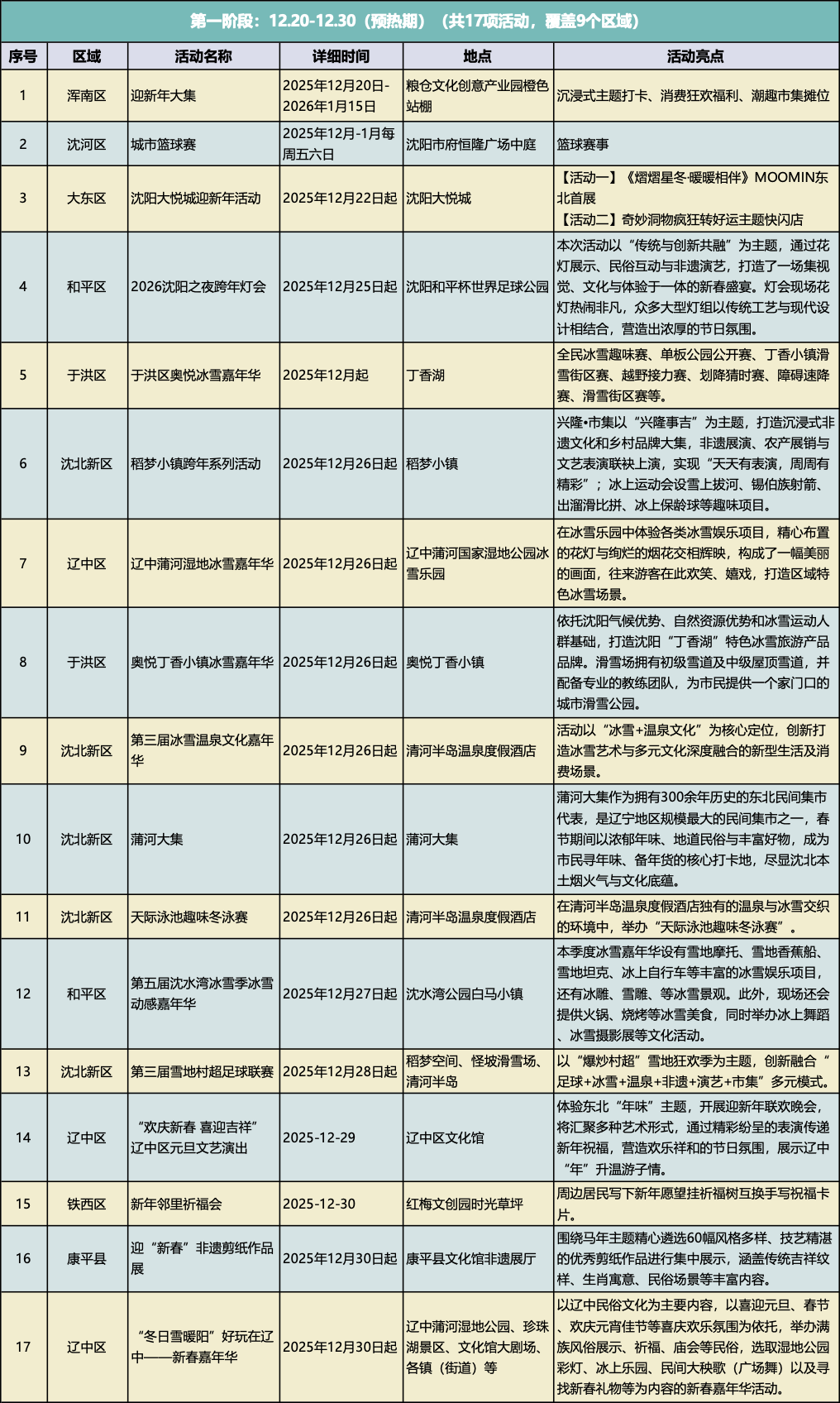 苏家屯区:推出迎春湖冰雪嘉年华、新年音乐会等活动。迎春湖冰雪嘉年华以“趣东北过大年”为主题,融合冰雪体验、文化市集、早市美食,打造区域性文旅打卡地。